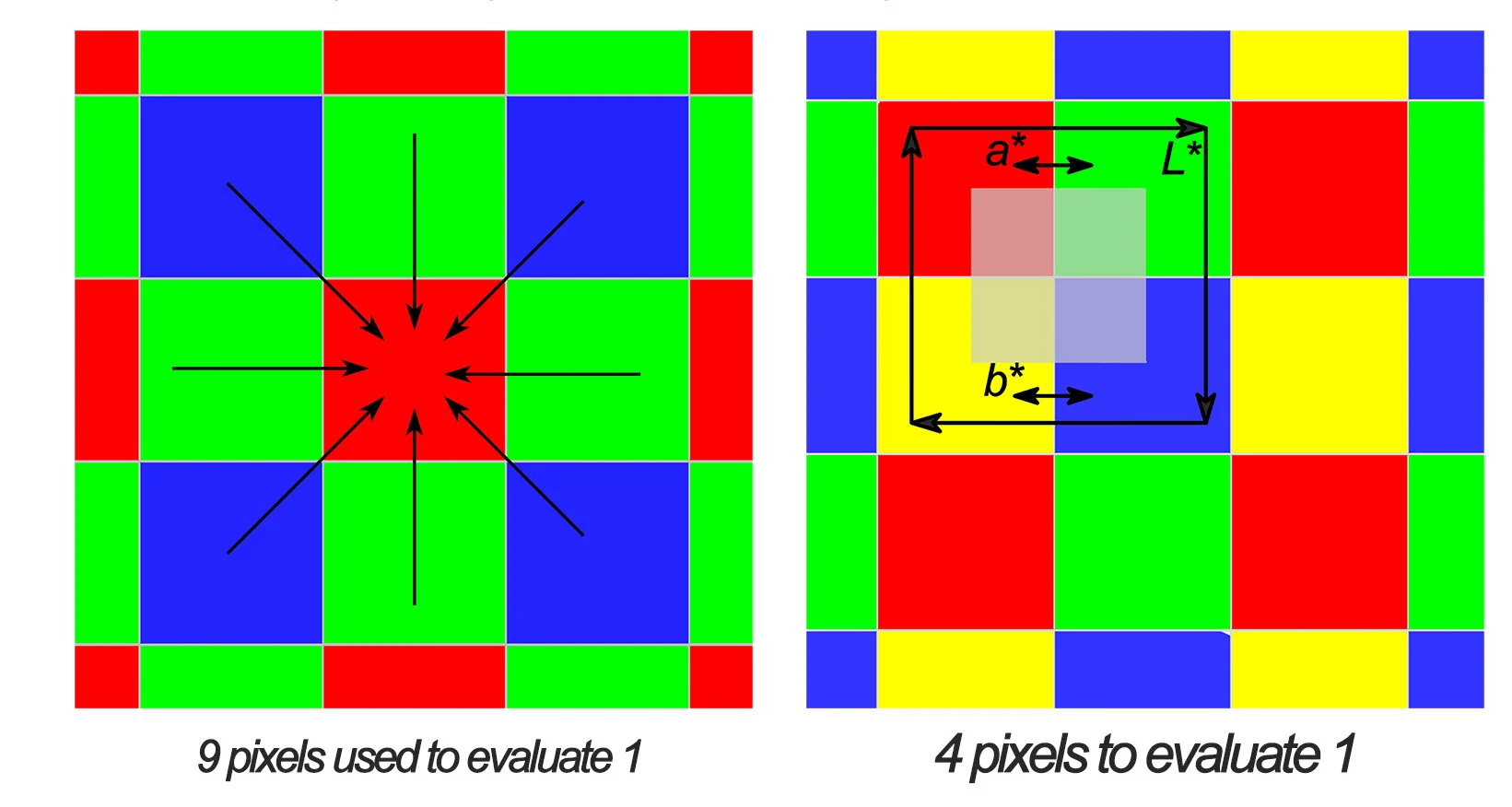 An L*a*b* system compares red to green to evaluate a* and compares yellow to blue to evaluate b*. It can also evaluate overall brightness, L*, by summing the same 4 pixels. Equivalent L*a*b* data can be obtained for each intersection point, possibly yielding both better color quality and better spatial resolution.